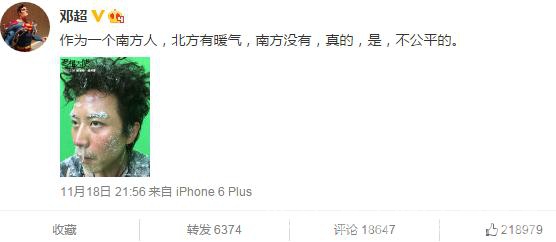 随着天气转冷,网友纷纷关注起暖气的问题,邓超也在微博上晒出一张脸被冻僵、鼻涕流出来被冻成冰的照片,并附文称“作为一个南方人,北方有暖气,南方没有,真的,是,不公平的。”