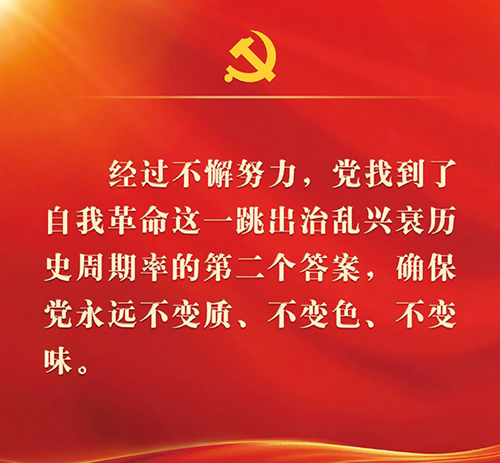 二、经过不懈努力,党找到了自我革命这一跳出治乱兴衰历史周期率的第二个答案,确保党永远不变质、不变色、不变味。
