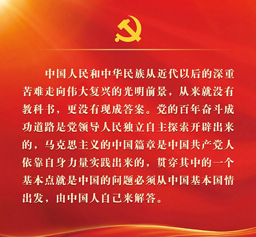六、中国人民和中华民族从近代以后的深重苦难走向伟大复兴的光明前景,从来就没有教科书,更没有现成答案。党的百年奋斗成功道路是党领导人民独立自主探索开辟出来的,马克思主义的中国篇章是中国共产党人依靠自身力量实践出来的,贯穿其中的一个基本点就是中国的问题从中国基本国情出发,由中国人自己来解答。